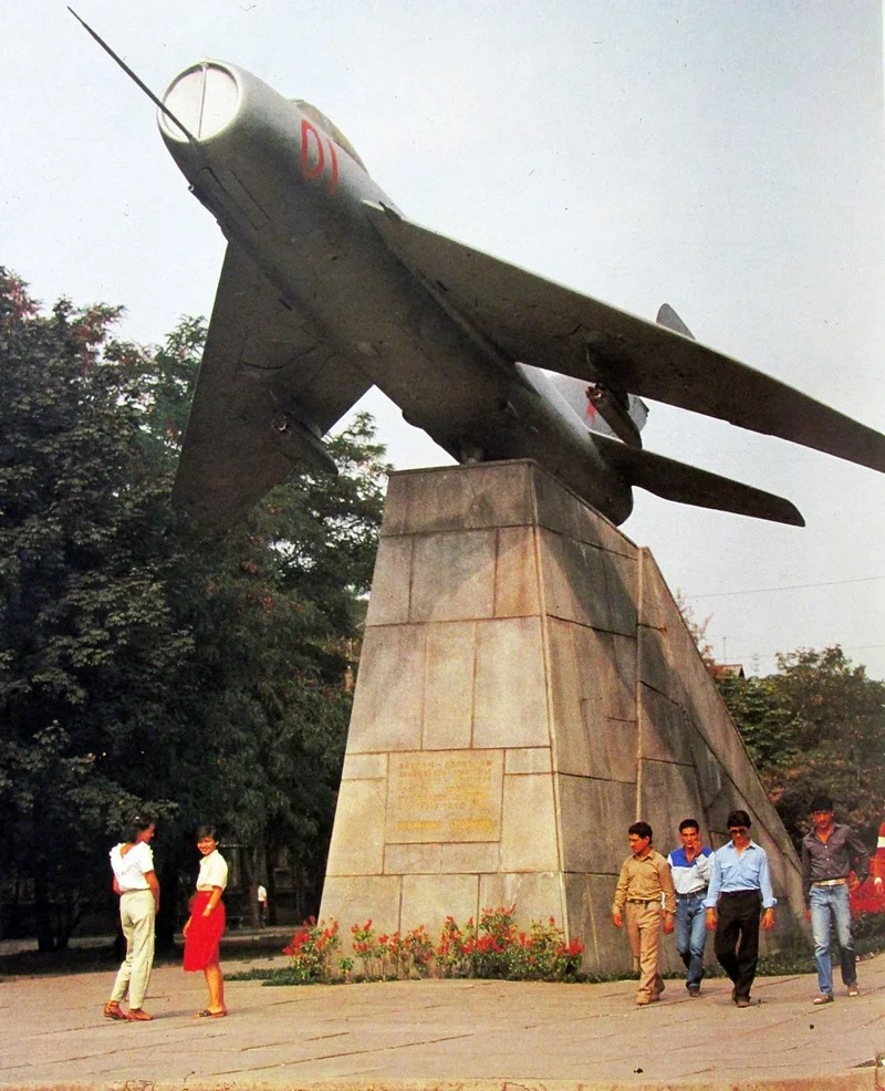 На проспекті Жданова (на майбутньому бульварі Шевченка) урочисто відкривають монумент-літак на честь воїнів-льотчиків, які захищали та звільняли Запоріжжя у 1941 та 1943 роках– авіаторам 8-ї та 17-ї повітряних армій. На постаменті – літак. Причому реактивний МіГ-19, який ніякого відношення до війни, звичайно ж, не мав. Кажуть, все тому що міському керівництву ідея в голову прийшла, о ось літак часів війни так знайти і не змогли. Зате на території місцевої авіашколи якраз «припадав пилом» МіГ-19…