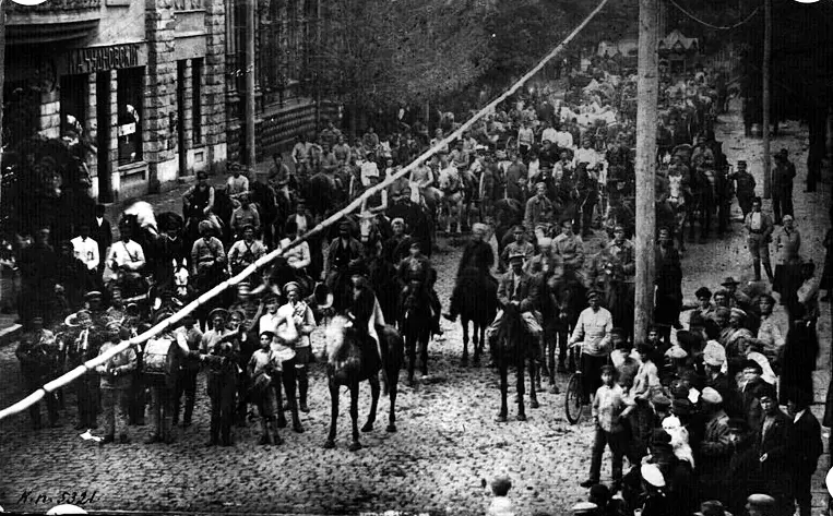 На фото: парад махновців на вулиці Соборній в Олександрівську. Район сучасного театру Магара, фотограф знімає з будинку Лящинського