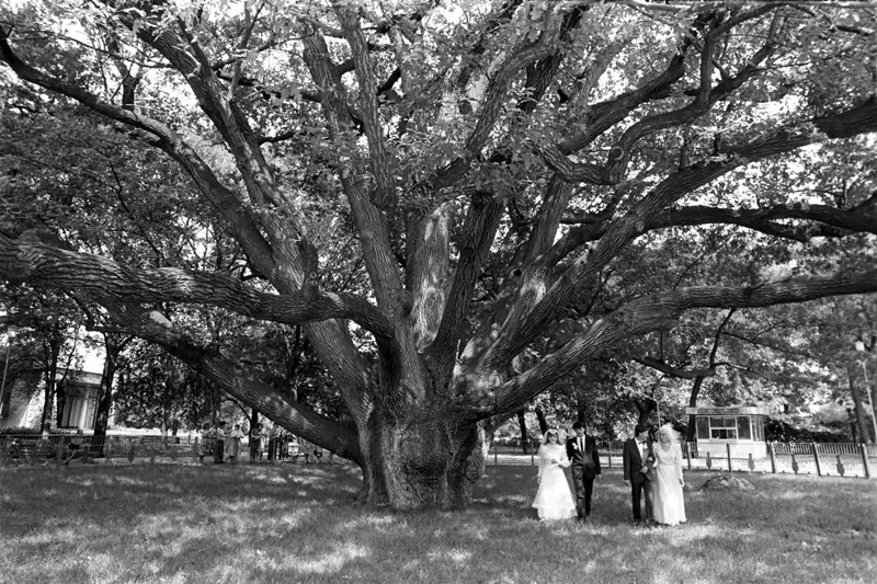 На фото: 1988 рік, Запорізький дуб – традиційна тоді ще зпинка весільних кортежей запоріжців.