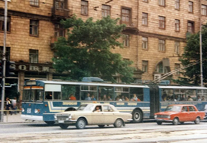 На фото: 1992 рік, “гармошка” на проспекті. На борту напис: “Запорізький електроапаратний завод – мешканцям Запоріжжя” (transphoto.org).