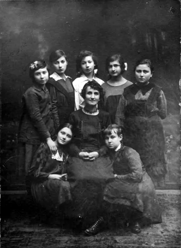 Олександрівськ, січень 1920 року. Марія Могілко разом зі своїми ученицями (Віра Барац, Роза Юделович, Іра Коледа, Люся Гуревич, Нана Мознаїм, Міра Новельман). Дівчата прийшли подякувати вчительці за те, що вона під час єврейского погрому, який відбувся при денікінцях, переховувала в себе родину своїх ссуідів-євреїв.