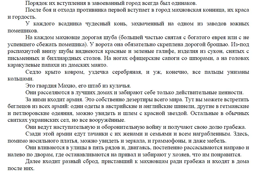Олександрівці тоді очікували приходу до міста більшовиків, але в Олександрівськ, вже втретє у 1919 році, ввійшли махновці. Та ж Марія Могилко у своїх спогадах «Недавнє минуле» написала й про їхній прихід. Фрагмент її мемуарів – нижче.