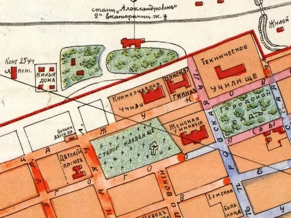 Старе кладовище на мапі Олександрівська (жіноча гімназія – зараз 3 корпус ЗНУ)
