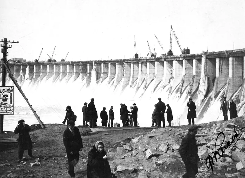 «Пять лет тому назад, в начале 1927 года, было образовано Правление Днепровского строительства, а 16 апреля 1932 года, в 14 ч. 20 м., первый агрегат, пущенный в первый пробный пуск, плавно сделал свои первые обороты под напором пущенной через напорную трубу воды».
