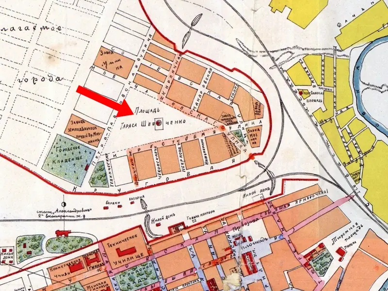 Площа Тараса Шевченка на мапі Олександрівська 1913 року.
