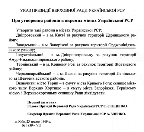 23 травня 1969 року Президія Верховної Ради Української РСР своїм указом утворює в місті Запоріжжя новий район – Заводський.