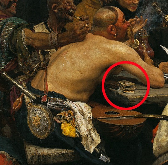 Людина, зображена оголеною на картині Рєпіна, ніхто інший, як банкомет – той, хто роздає карти. Тому гральна колода поруч із ним намальована невипадково. Такі люди за часів Запорізької Січі традиційно знімали верхній одяг, щоб не було сумнівів у їхній чесності, адже в цьому випадку не було можливості сховати карту у рукав.